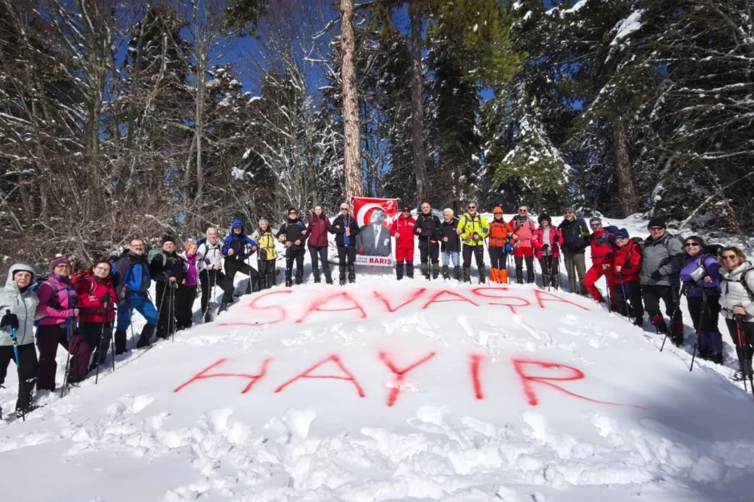 Kulüp üyeleri ve katılımcılar, dünya genelindeki savaş ve çatışmalara dikkat çekmek için anlamlı bir mesaj paylaştı. Beyaz kar üzerine büyük harflerle 'Savaşa Hayır' yazan doğaseverler, sporun barış elçisi ve birleştirici gücünü bir kez daha gösterdi.