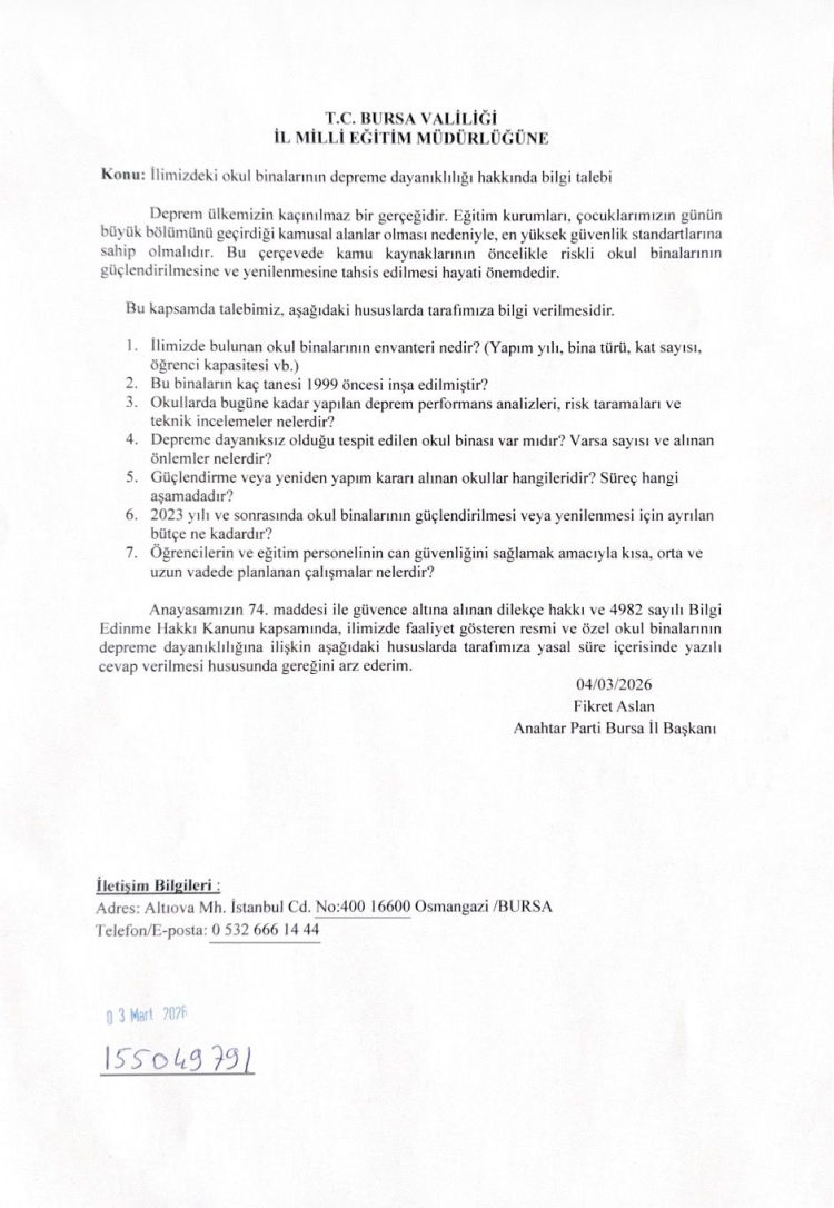 Anahtar Parti yöneticileri dilekçelerinde, Bursa’daki okul binalarının mevcut durumu hakkında detaylı bilgi talep etti. Bu kapsamda; il genelindeki okul binalarının envanteri, kaç tanesinin 1999 yılı öncesinde inşa edildiği, bugüne kadar yapılan deprem performans analizleri ve risk taramaları soruldu.
