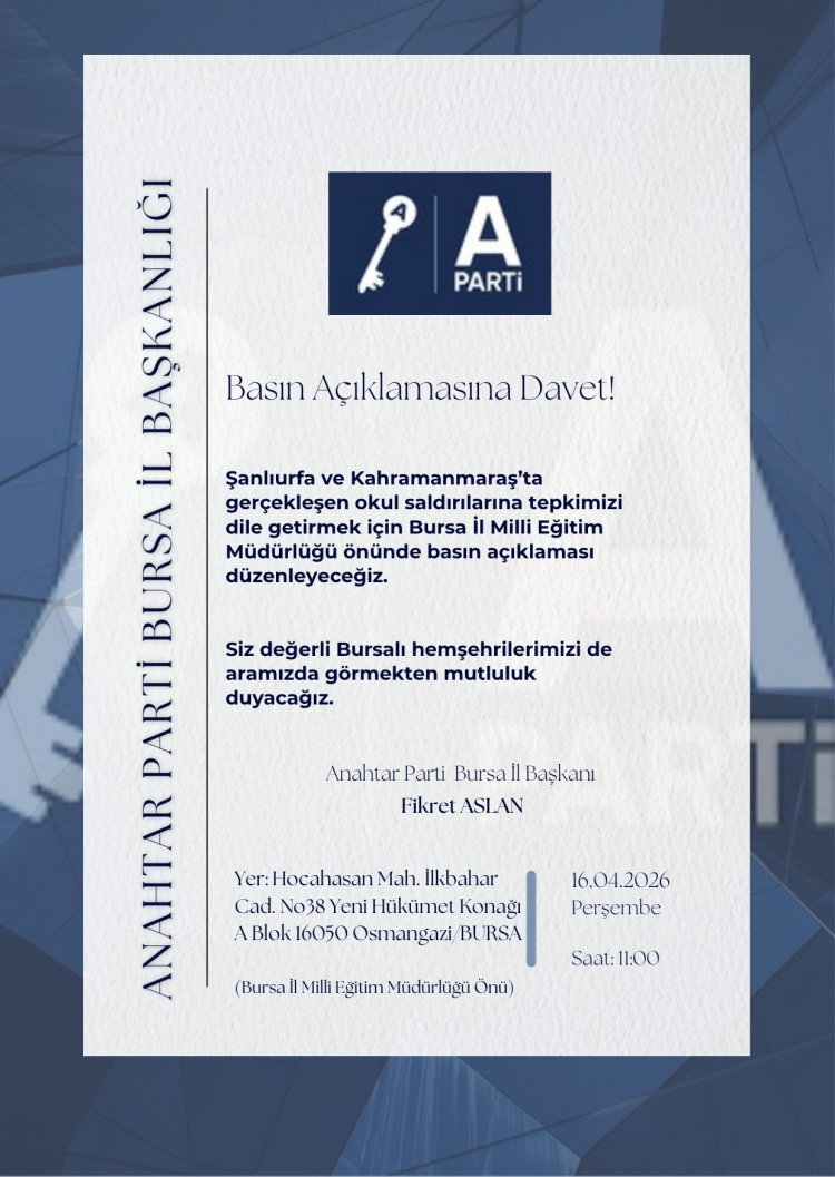 Bursa İl Başkanı Fikret Aslan ve merkez ilçeler ile parti gönüllülerinin güçlü şekilde katılacağı öngörülen basın açıklaması, Bursa Milli Eğitim Müdürlüğü önünde saat 11:00'da yapılacak.