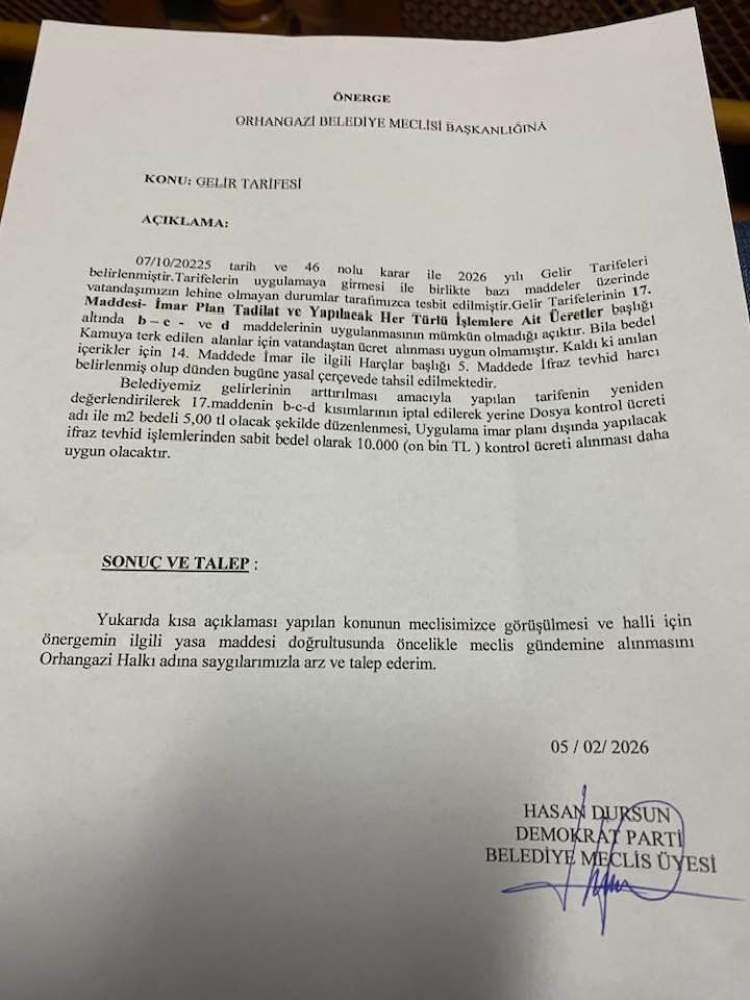 Dursun’un 5 Şubat 2026 tarihli önergesinde, belediyenin gelir tarifesine ilişkin bazı güncellemelerin yapılması ve özellikle imar planı işlemlerine yönelik alınan ücretlerin gözden geçirilmesi talep ediliyor. Önergede, vatandaşların lehine olacak düzenlemeler yapılması ve uygulamada karşılaşılan bazı hukuki ve idari sorunların çözülmesi gerektiği belirtiliyor.