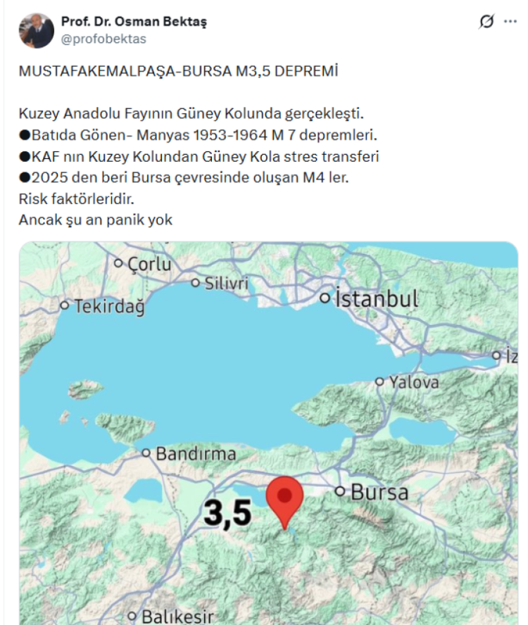 Bursa'nın Mustafakemalpaşa ilçesinde meydana gelen 3.5 büyüklüğündeki depremin ardından yer bilimci Prof. Dr. Osman Bektaş'tan değerlendirme geldi.