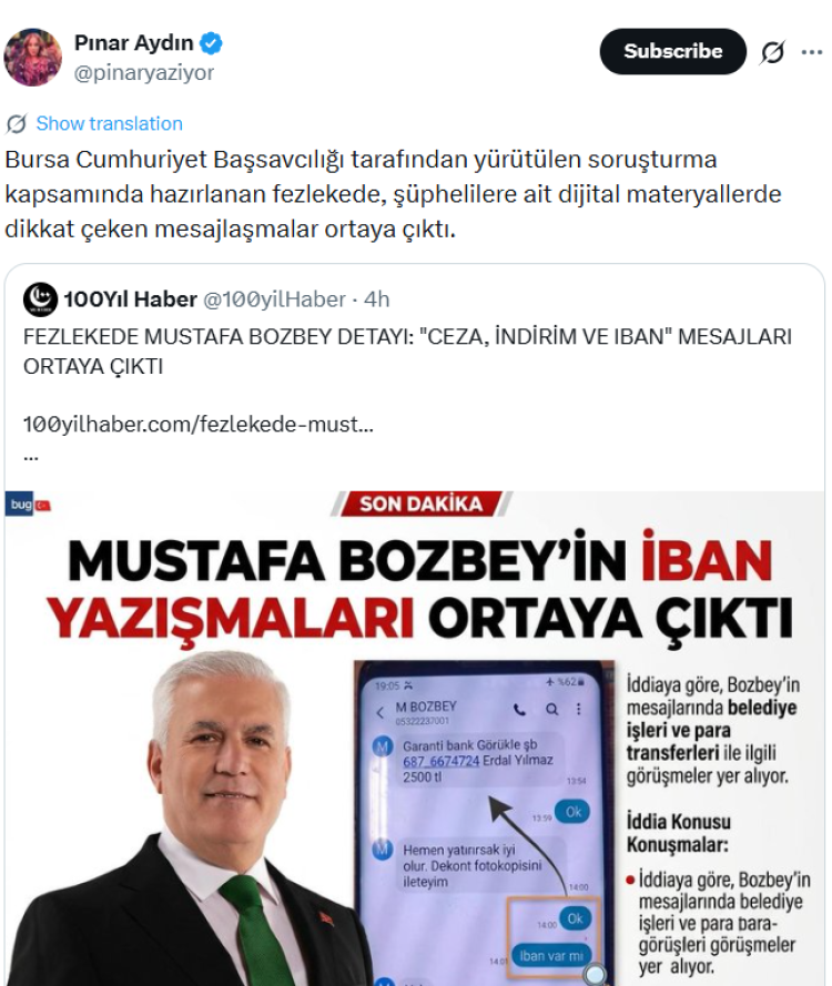 Gazeteci Pınar Aydın’ın haberine göre, Mustafa Bozbey ile ilgili yürütülen soruşturma kapsamında hazırlanan fezlekede dikkat çeken mesajlaşmaların yer aldığı öne sürüldü.