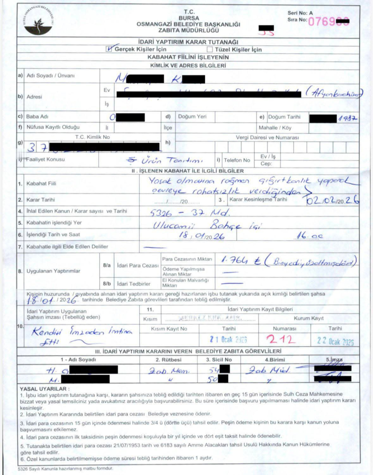 Bu sırada Osmangazi Belediyesi’ne bağlı zabıta ekiplerinin gençler hakkında idari yaptırım tutanağı tuttuğu ileri sürüldü. Tutanağın “faaliyetin konusu” bölümüne “ürün tanıtımı” yazıldığı, kabahat fiili olarak ise “yasak olmasına rağmen çığırtkanlık yaparak çevreye rahatsızlık vermek” ifadesinin yer aldığı iddia edildi.