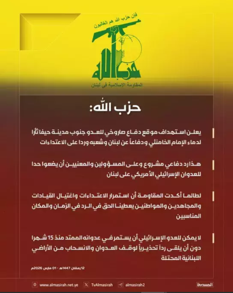 Hizbullah, İsrail'e karşı dün gece Hayfa'daki Mişmar el-Karmel füze savunma sistemine saldırı düzenlediğini duyurdu. Açıklamada, saldırının Ayetullah Hamaney'in hedef alınmasının intikamı ve Lübnan'ı koruma amacı taşıdığı belirtildi. Hizbullah, saldırıyı