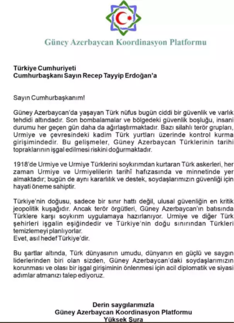 Güney Azerbaycan Koordinasyon Platformu, Cumhurbaşkanı Erdoğan'a gönderdiği mektupta Güney Azerbaycan'daki Türk nüfusun güvenliği için Türkiye'den acil diplomatik ve siyasi destek talep etti. Mektupta "Terör örgütleri, Güney Azerbaycan'ın batısında Türklere karşı soykırım uygulamaya hazırlanıyor. Urmiye ve diğer Türk şehirleri işgalin eşiğindedir ve Türkiye'nin doğu sınırından Türkleri temizlemeyi planlıyorlar. Evet, asıl hedef Türkiye'dir" ifadeleri yer aldı.