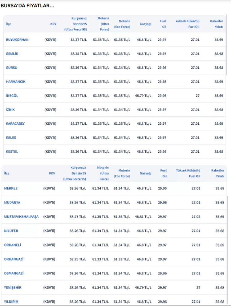 Adana'da 62,44 TL, Tunceli'de 63,30 TL, Hakkari'de 63,32 TL, Bingöl ve Bitlis'te 63,30 TL'den satışa sunuluyor.