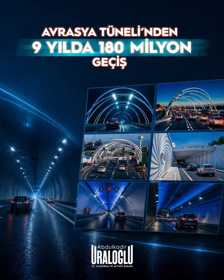 Ulaştırma ve Altyapı Bakanı Abdulkadir Uraloğlu, Avrasya Tüneli’nin 9 yılda 180 milyon araç geçişine ulaştığını, projenin zaman ve yakıt tasarrufuyla ekonomiye katkı sağladığını açıkladı.