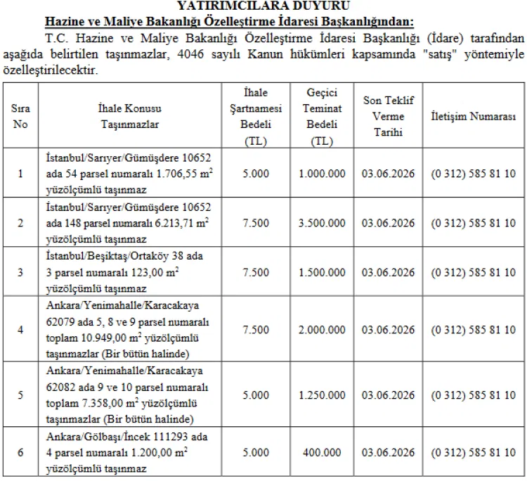 İstanbul ve Ankara illerinde yer alan toplam 6 taşınmaz, 4046 sayılı Özelleştirme Kanunu çerçevesinde “satış” yöntemiyle ihale edilecek. Taşınmazlar arasında Sarıyer (İstanbul), Beşiktaş (İstanbul), Yenimahalle (Ankara) ve Gölbaşı (Ankara) gibi bölgelerde yer alan arsalar bulunuyor.